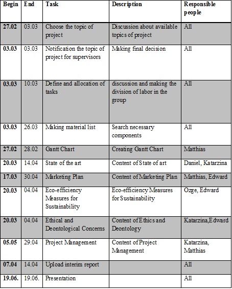 We created a Gantt chart to give us a good overview of our project. We also created a task list to assign specific tasks to specific team members depending on what they preferred and their previous knowledge.